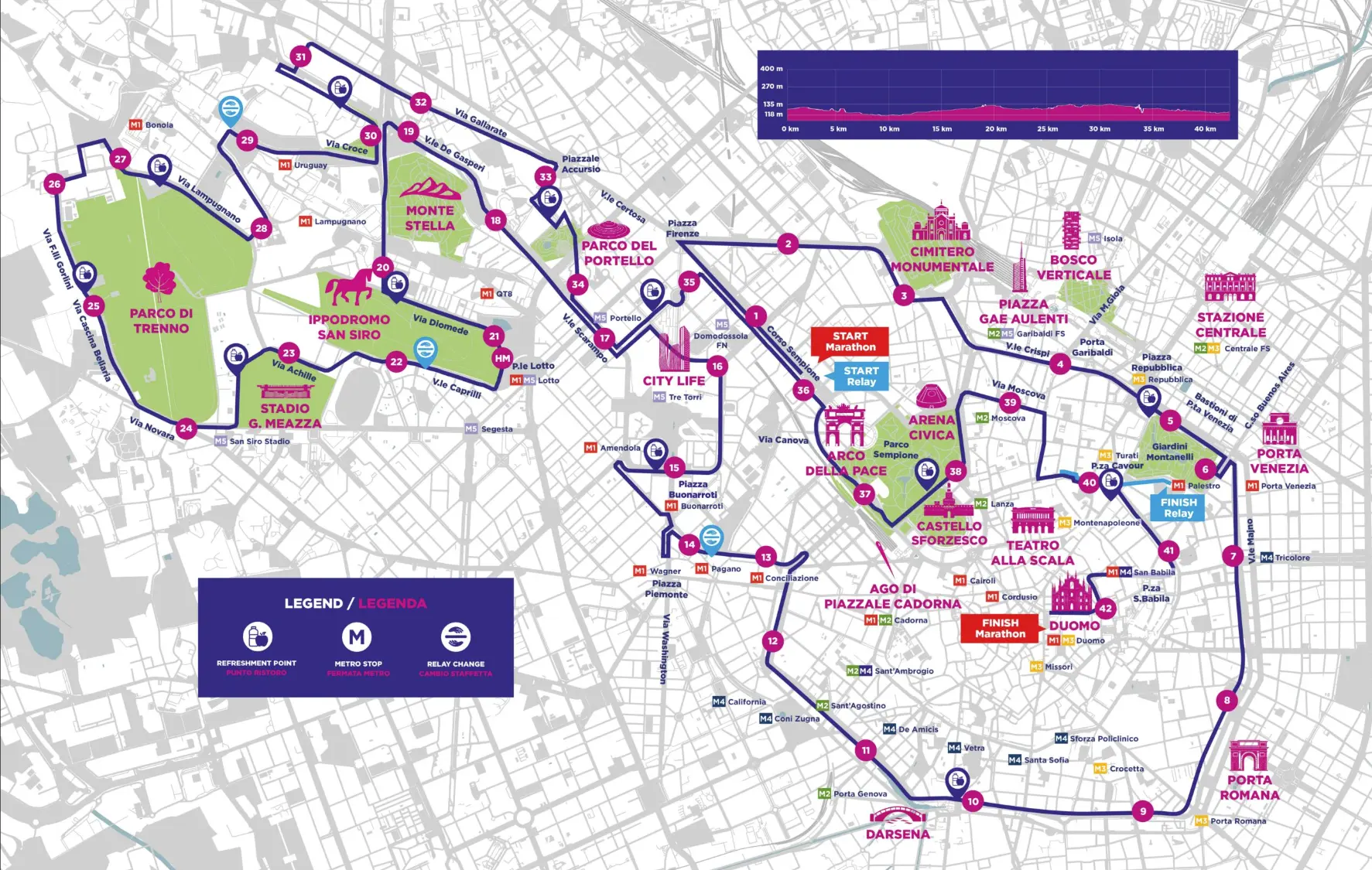 The course begins in the heart of Milan, at Piazza del Duomo, a central and iconic location for the start of this prestigious event. The finish line is situated at the vibrant Piazza Castello, providing a scenic backdrop as runners complete their 42.195 kilometers.